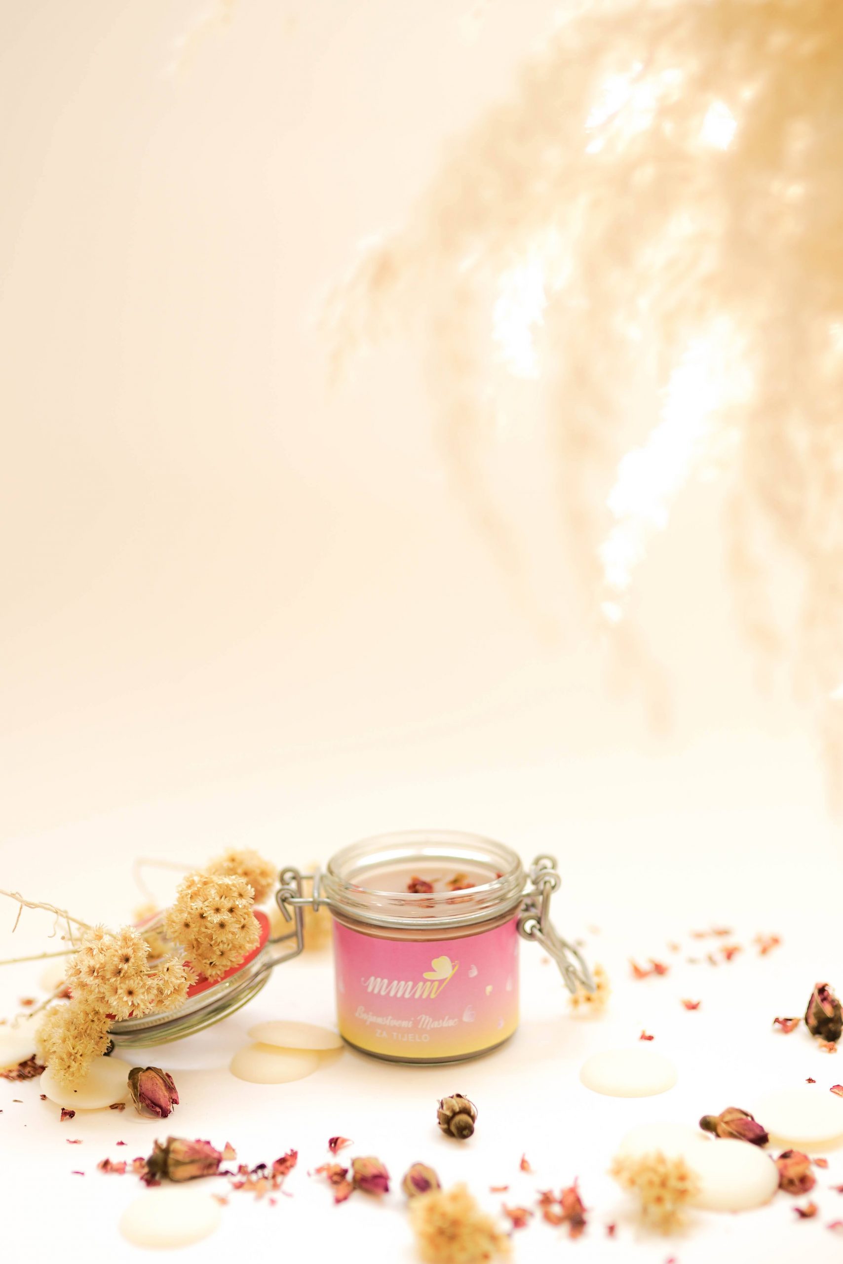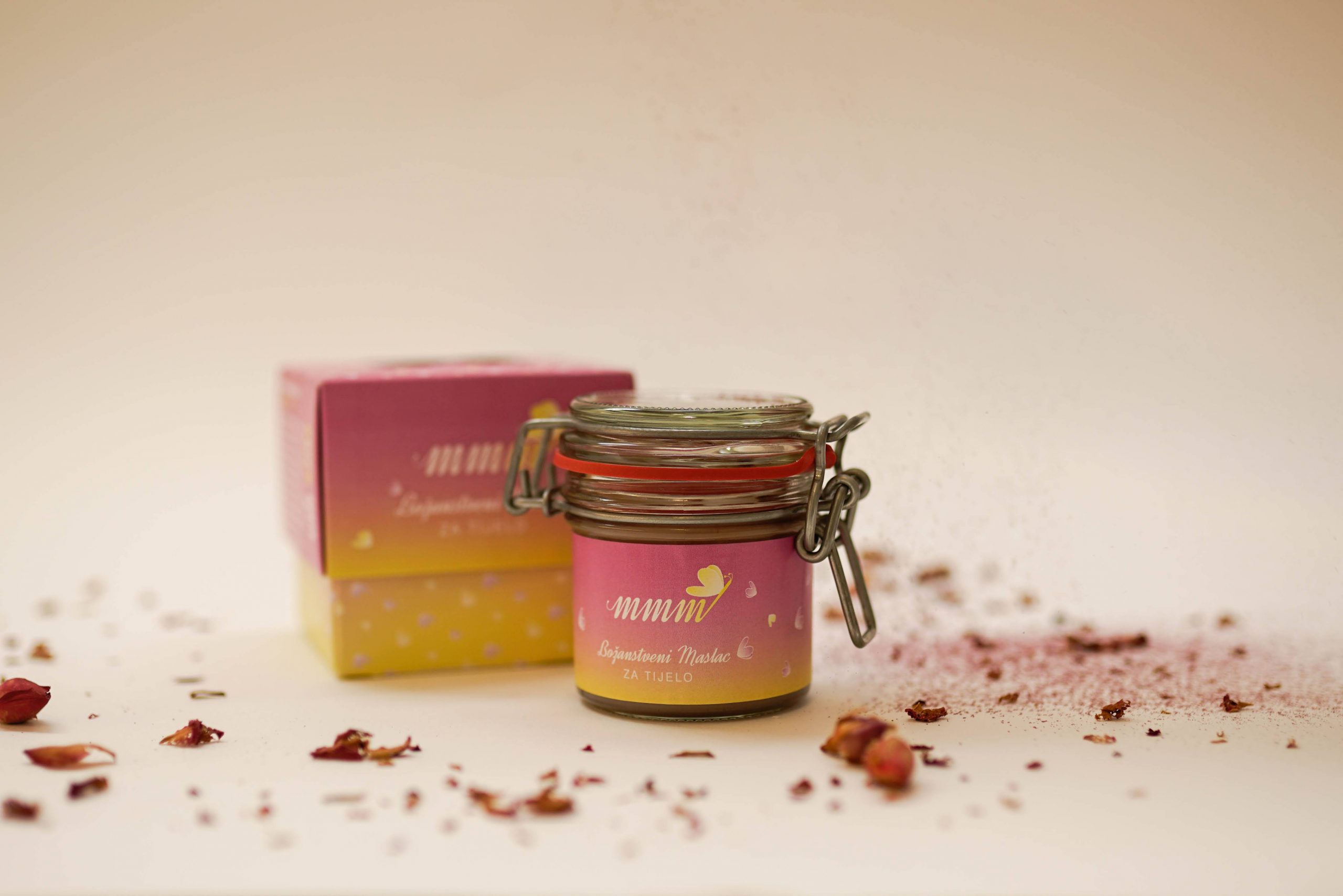 “Ne stavljajte na kožu nešto što ne biste i pojeli”, pravilo je kojeg se važno pridržavati posebno kod korištenja proizvoda koji se nanose na površinu cijelog tijela. Upravo je, vodeći se tim pravilom, osmišljen Božanstveni maslac za tijelo, koji predstavlja jedinstveni spoj dragocjenih ulja koja dubinski njeguju, štite i hrane kožu: esencija cvjetova smilja maceriranih u ekstra djevičanskom maslinovom ulju, hladno prešano ulje kokosa, shea maslac, kakao maslaca te babasu ulje. Za blago ružičastu boju zaslužan je prah ruže Damask, a za diskretan miris prirodni ekstrakt latica ruža. Ukrašeno dehidriranim laticama ruže.
